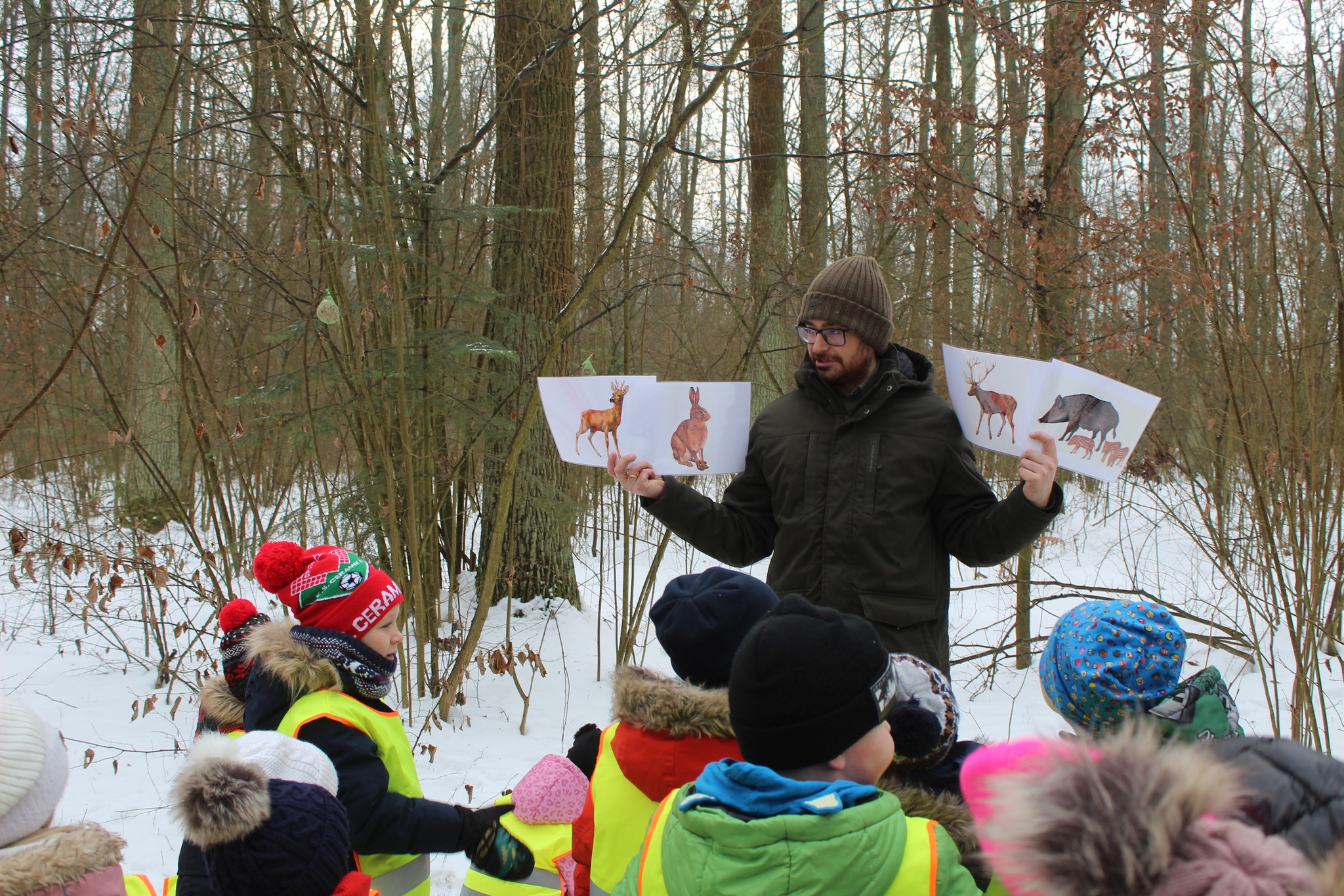 Podczas dzisiejszej zimowej wycieczki do lasu Pan Karol Chajdecki -Specjalista ds. edukacji i komunikacji z Nadleśnictwo Opoczno Lasy Państwowe wyjaśnił przedszkolakom te zagadkowe pojęcia. Dowiedzieliśmy się także czym różni się trop od śladu. Gdy spadnie z nieba biały śnieg nie tak trudno zostać leśnym detektywem - powiedział Pan Karol. Wystarczy poznać kilka sekretów a podglądanie zwierzaków w ich naturalnym środowisku wcale nie będzie takie trudne.
