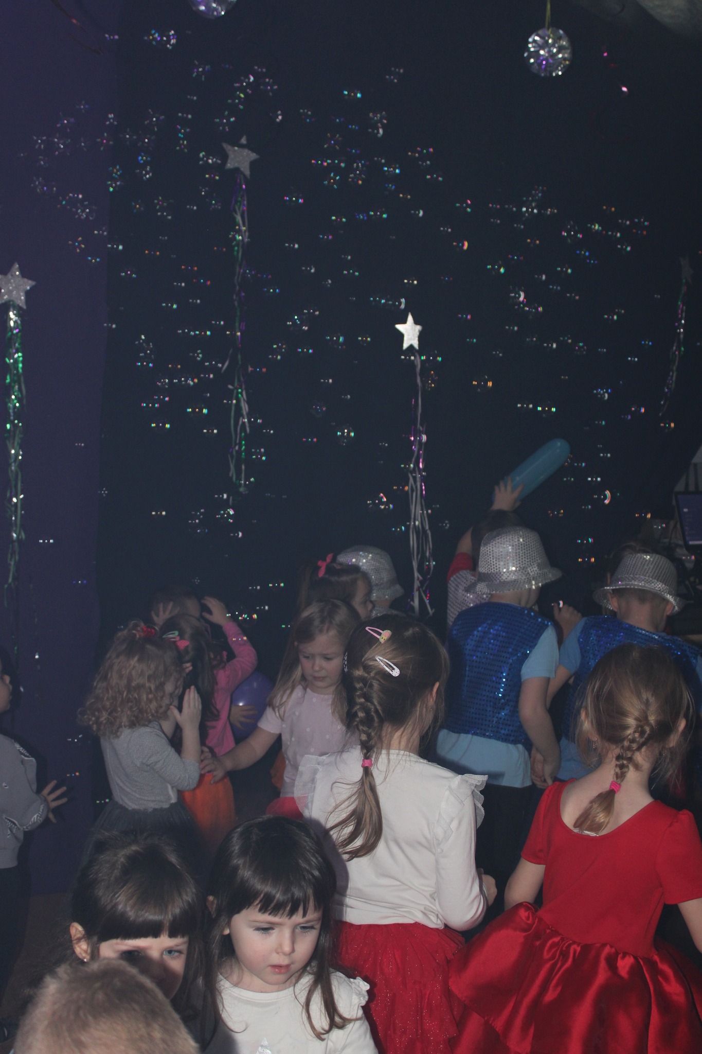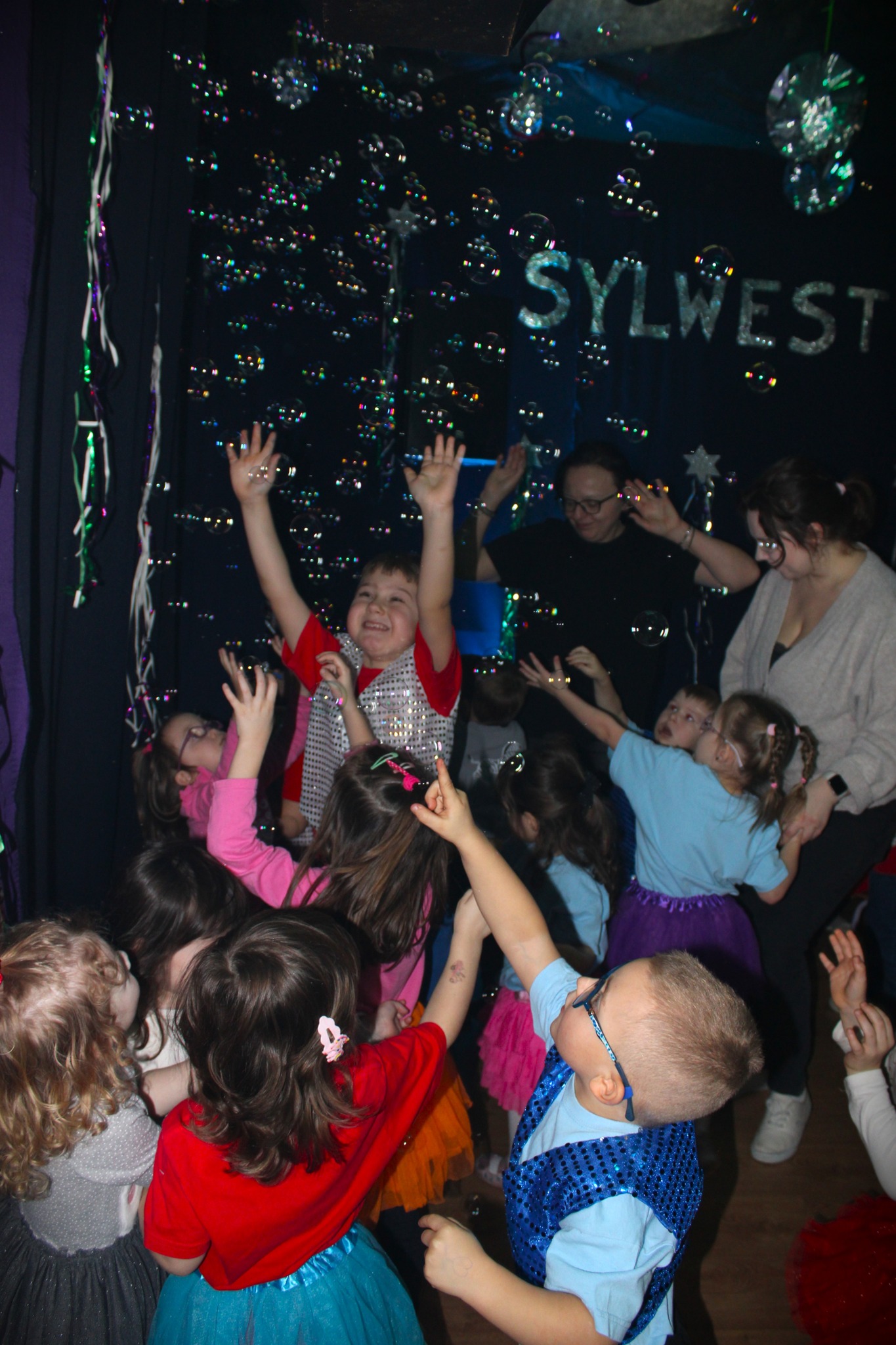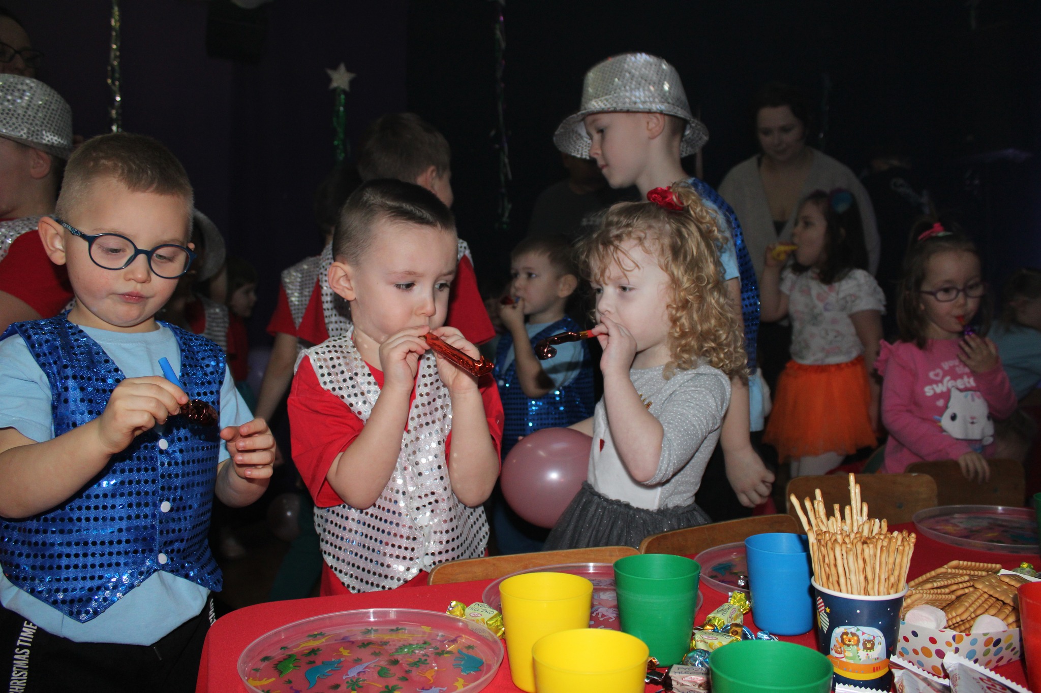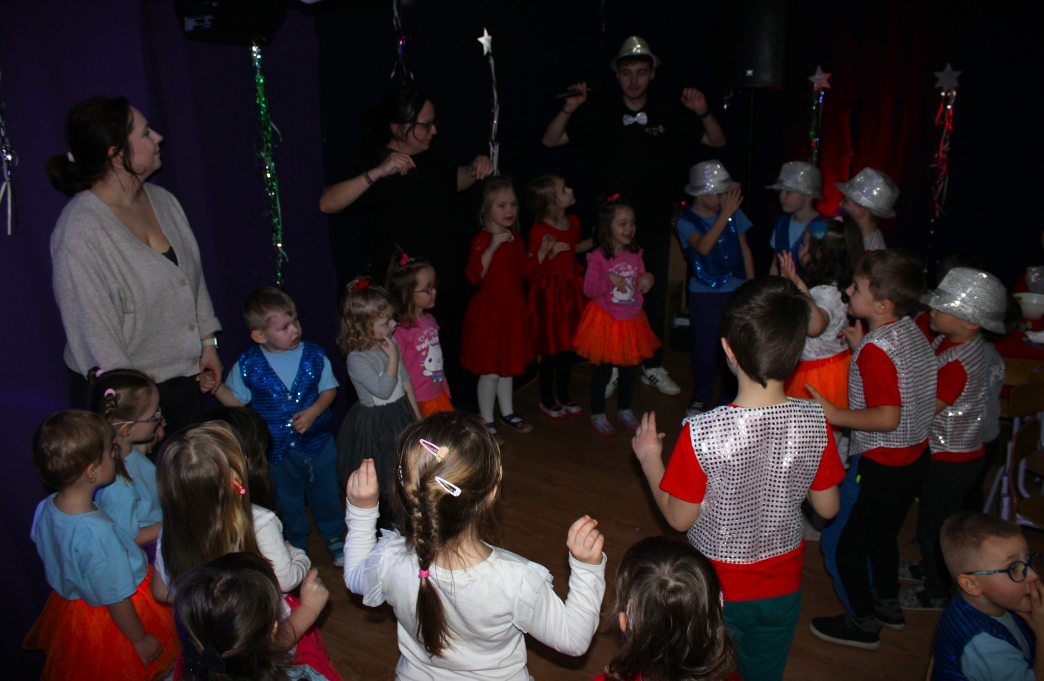 Wszyscy nasi milusińscy bawili się fantastycznie! Pan Jakub spełniał życzenia przedszkolaków, bo co niektórzy już mają zdecydowane gusta muzyczne! Tradycyjnie, powitaliśmy Nowy Rok 2026 oranżadą życząc sobie wszystkiego dobrego!