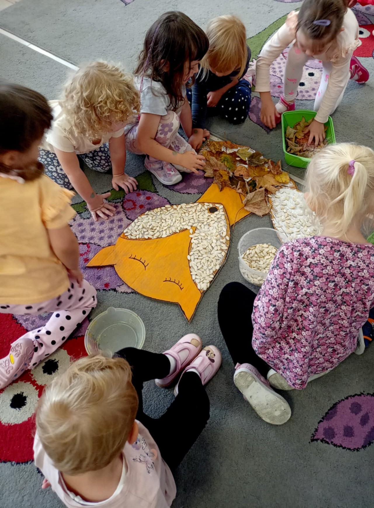 Maluszki tym razem wspólnie tworzyły pracę plastyczną, której celem była integracja. Praca grupowa wzmacnia więzi i postawy społeczne, rozbudowuje kreatywność i rozwija wyobraźnię poprzez użycie różnych materiałów.